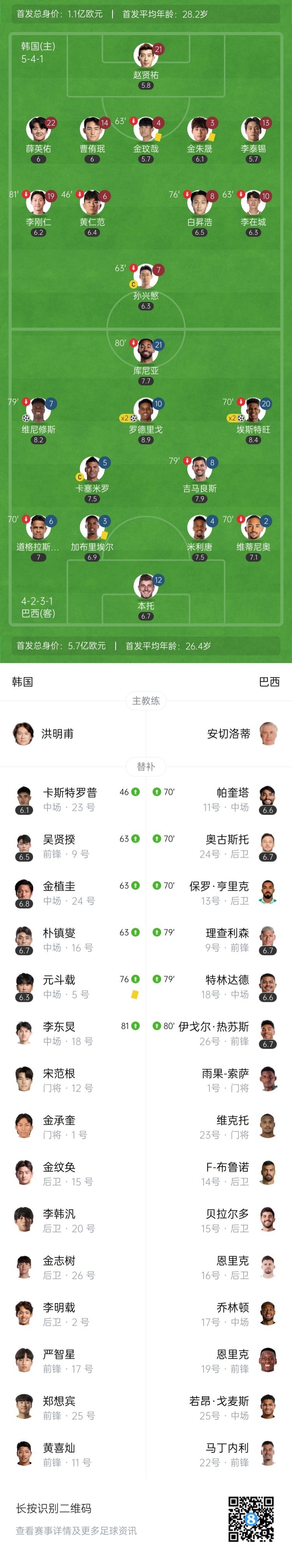 主场惨败!韩国0-5遭巴西血洗 埃斯特旺罗德里戈双响维尼修斯传射