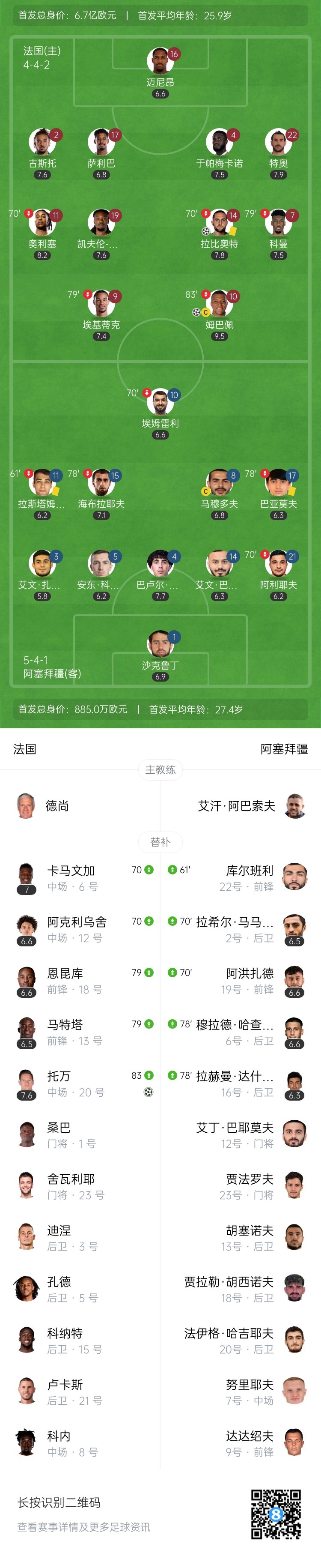 第69分钟,法国队右侧角球开出,第一点被解围不远,后点姆巴佩得球再传中,门前拉比奥特抢点头槌破门!法国2-0领先↓