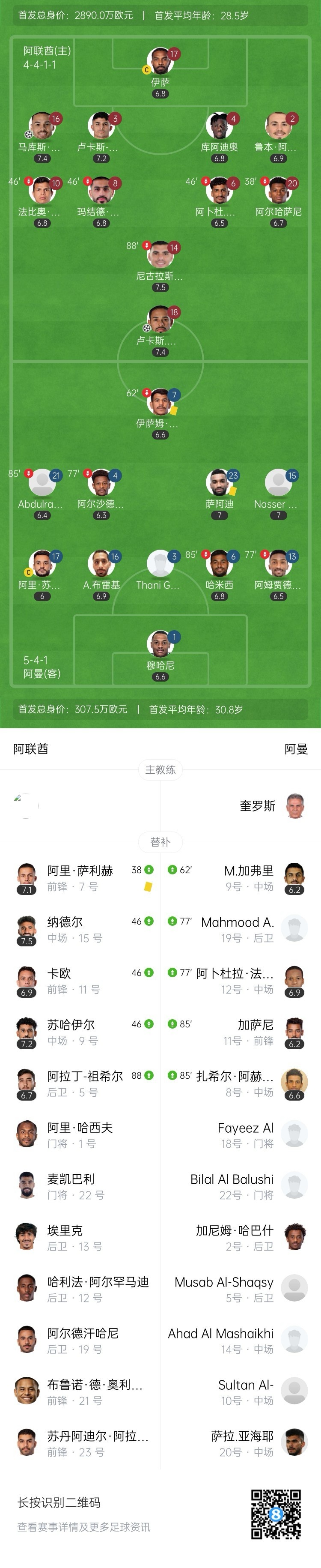 全场比赛结束,阿联酋2-1逆转阿曼。