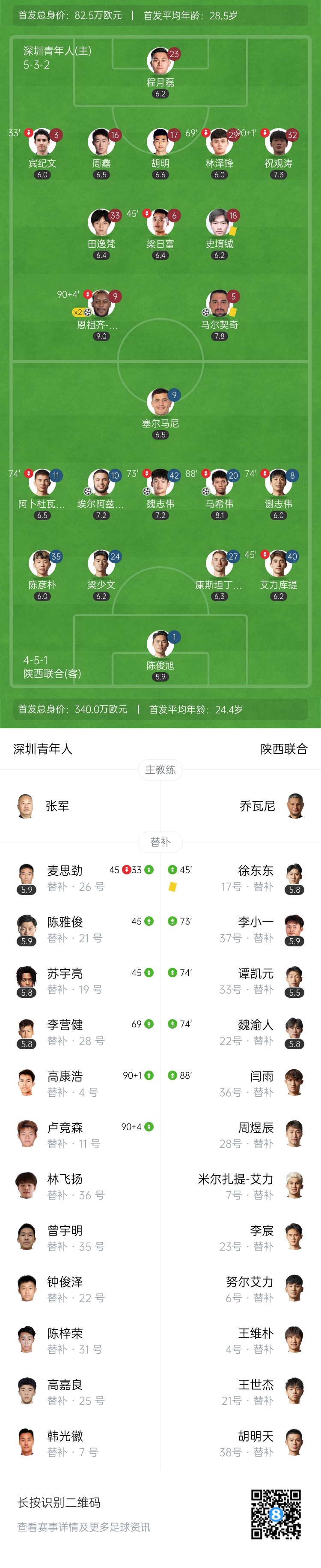 中甲-陕西联合3-3深圳青年人 马希伟传射 深圳仅领先降级区2分