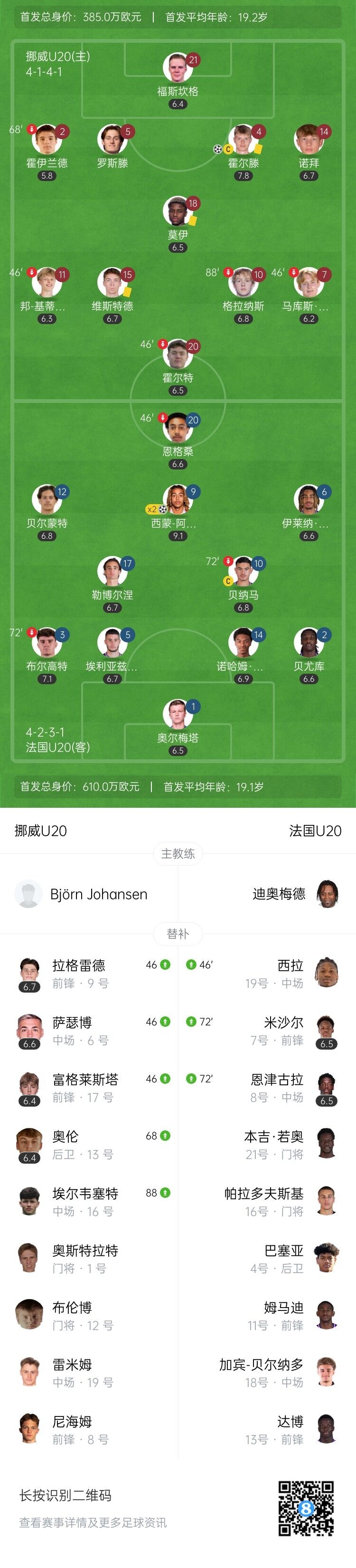 第57分钟,挪威U20有球员在对方禁区摔倒,主裁检查VAR后最终没有给点球。↓