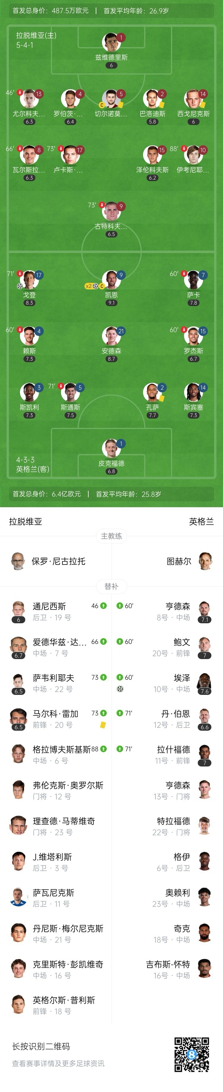 10月15日讯 北京时间10月15日凌晨2时45分,世预赛欧洲区小组赛K组第8轮,英格兰做客道加瓦球场对阵拉脱维亚。上半场,戈登首开纪录,凯恩扩大领先优势,随后凯恩点射破门。英格兰半场3-0领先拉脱维亚。下半场,通尼西斯自摆乌龙,埃泽替补建功。最终英格兰5-0大胜拉脱维亚,提前锁定小组头名,晋级至2026年世界杯决赛圈。