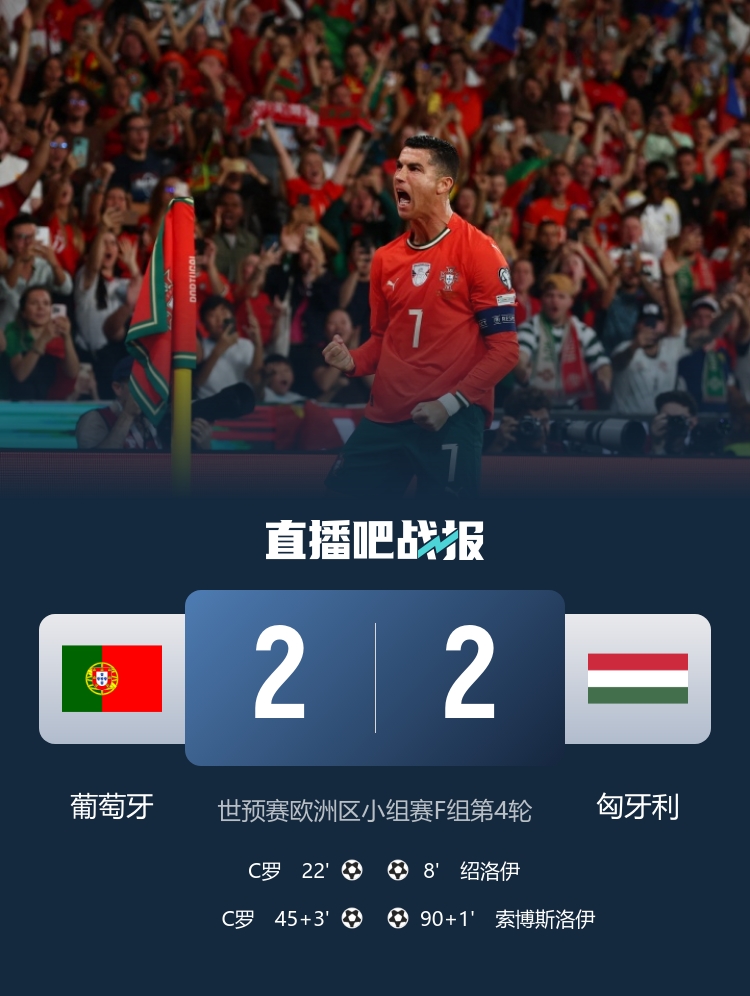 10月15日讯 世预赛欧洲区小组赛F组第4轮,葡萄牙坐镇主场阿尔瓦拉德球场迎战匈牙利。上半场,绍洛伊先拔头筹,C罗双响打进个人世预赛第41球独占历史射手王。易边再战,迪亚斯中柱,索博斯洛伊绝平。最终葡萄牙2-2匈牙利。积分榜方面,葡萄牙4轮10分无缘提前晋级世界杯,匈牙利5分第二。