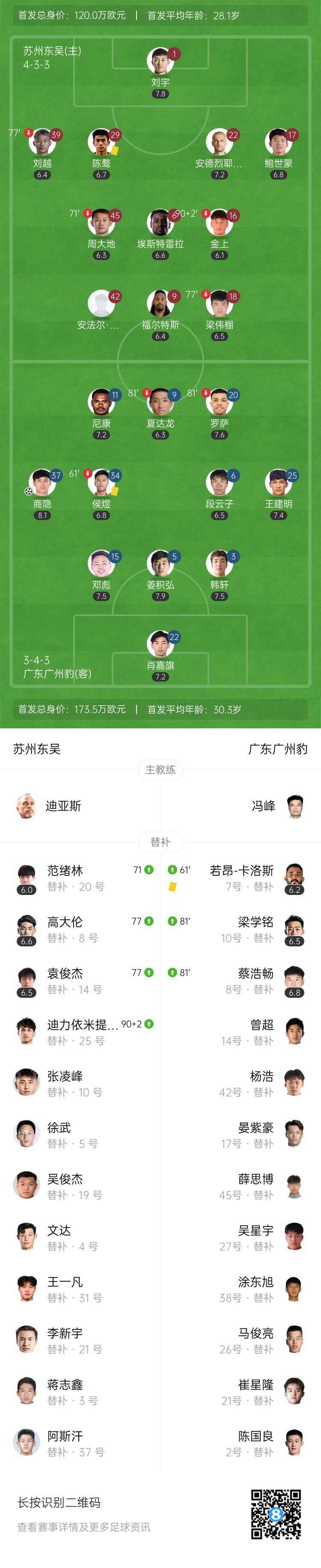 第68分钟,广州豹打破场上僵局,罗萨反越位成功送出传中球,商隐头球顶空门得手,广州豹1-0领先苏州东吴。↓
