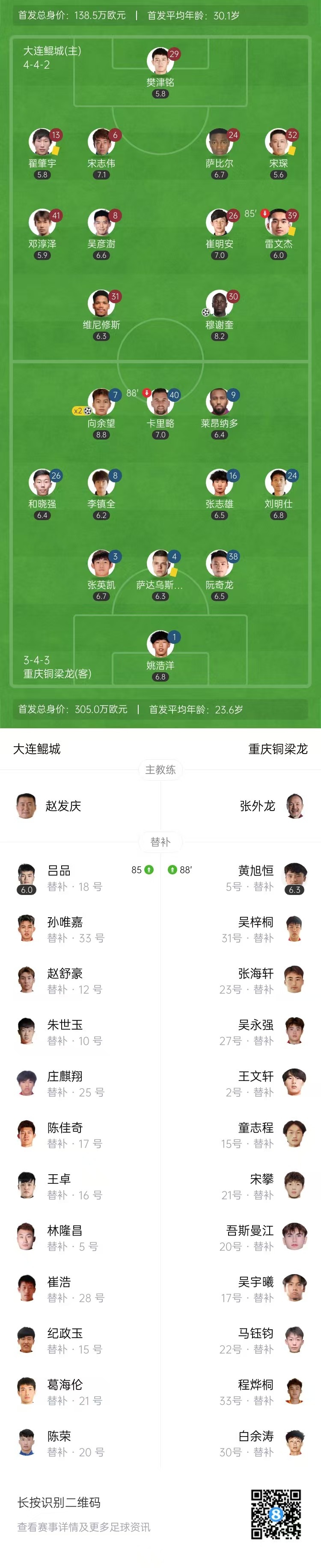 距榜首6分!铜梁龙2-1逆转大连鲲城 向余望世界波+双响近3轮4球