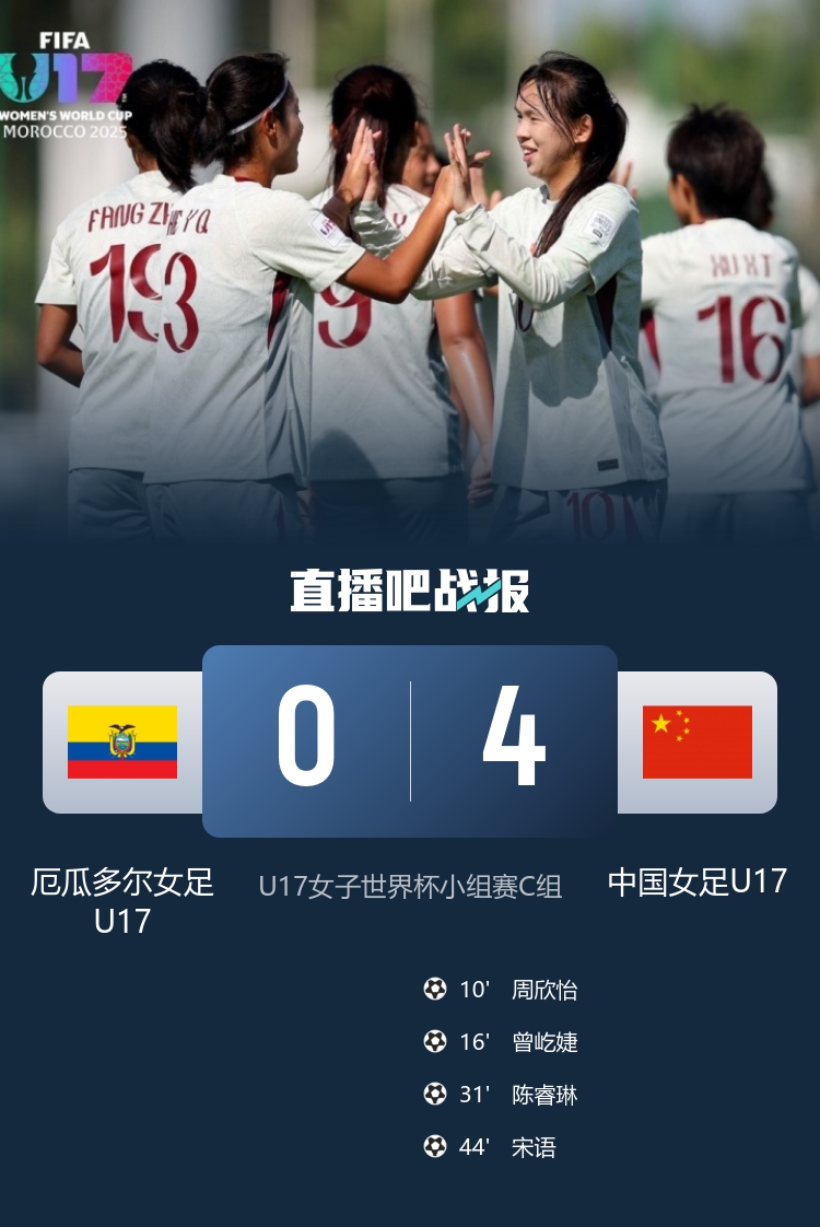 出线!U17女子世界杯:中国4-0厄瓜多尔晋级16强,四小花破门
