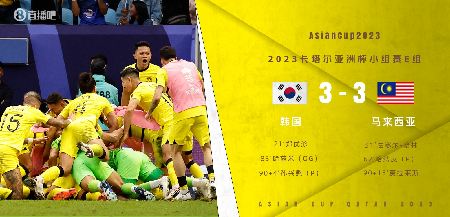 直播1月23日讯 北京时间1月23日晚上19:30,亚洲杯B组第3轮,韩国对阵马来西亚。上半场,郑优泳头球破门。下半场,黄仁范送礼法赛尔-哈林扳平,阿里夫-哈纳皮造点并操刀命中,李刚仁任意球制造进球,孙兴慜点球得手,莫拉莱斯绝平。全场结束,韩国3-3马来西亚。本场过后,韩国积5分排名小组第二,1/8决赛将对阵F组第一。