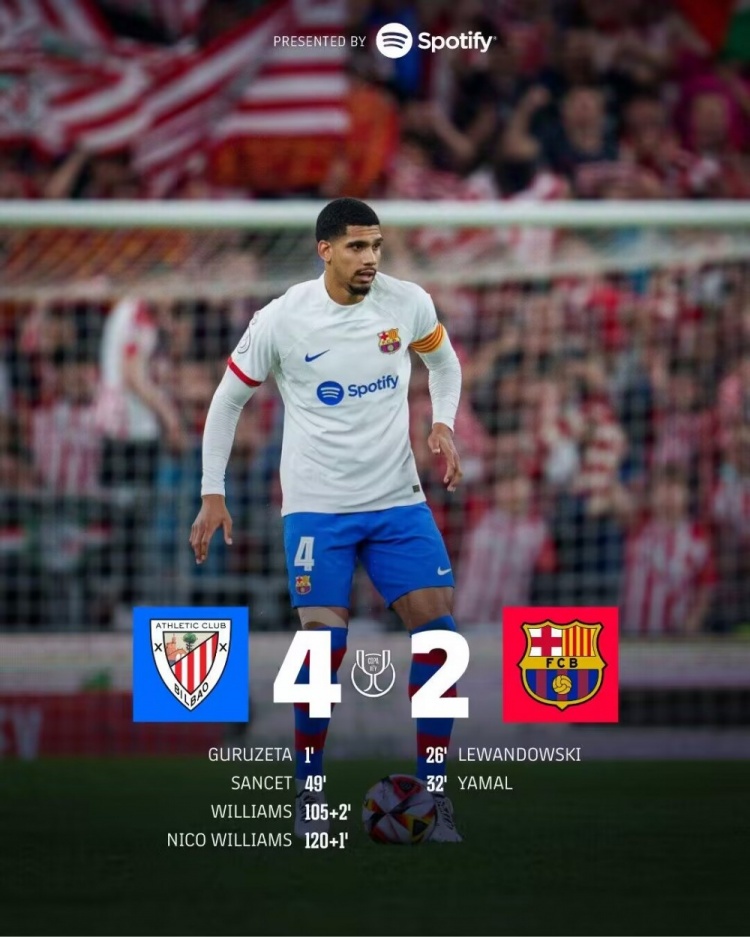 第105+2分钟,巴萨后场出现失误,伊纳基禁区内得球第一脚射门击中立柱弹回,后续自己再补射入网,毕巴3-2领先↓