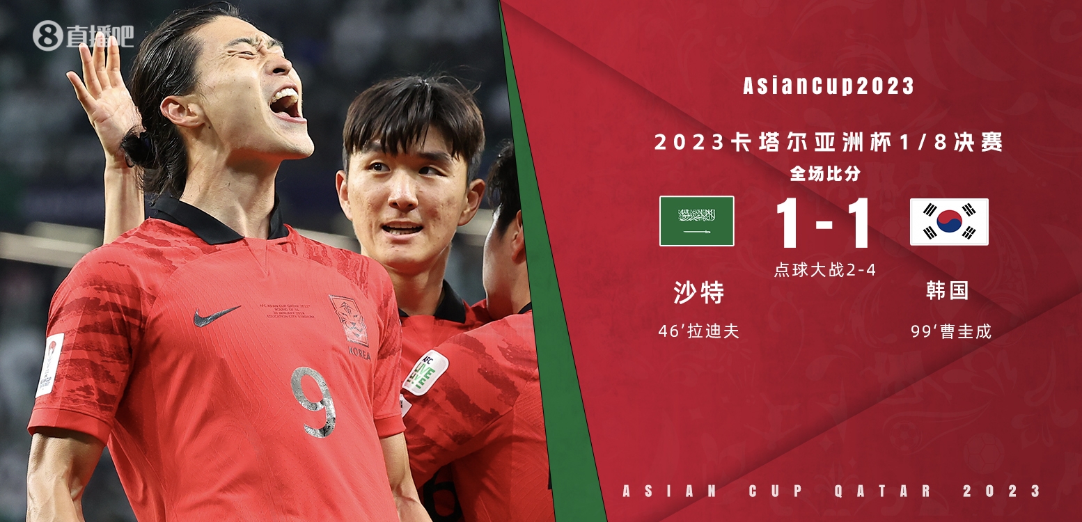 1月31日讯 北京时间1月31日0:00,亚洲杯淘汰赛十六强沙特迎战韩国的比赛,上半场孙兴慜低射造险,谢赫里和卡努头球中楣,半场结束,沙特0比0韩国。下半场刚开场拉迪夫单刀破门,曹圭成头球绝平,90分钟结束,沙特1-1韩国。加时赛韩国队失良机,点球战赵贤祐两次扑点,最终韩国点球大战5比3淘汰沙特,8强将战澳大利亚。