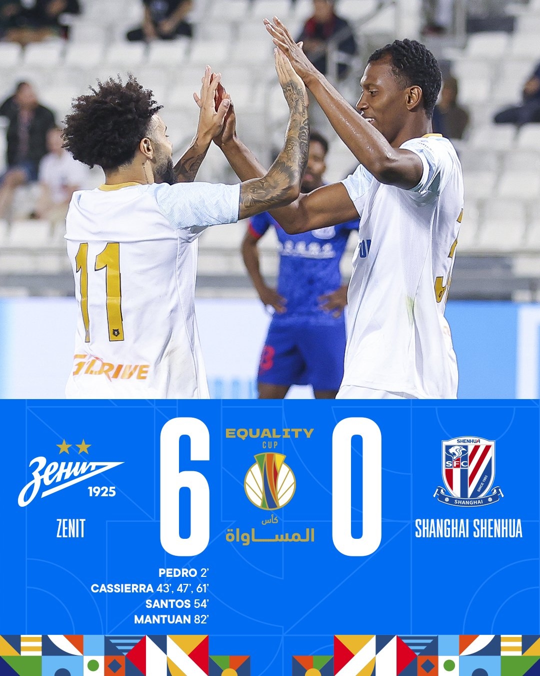 本场比赛泽尼特的哥伦比亚前锋卡谢拉上演帽子戏法、此外24号佩德里尼奥、3-道格拉斯桑托斯、以及替补登场的前锋古斯塔沃分别攻入一球。