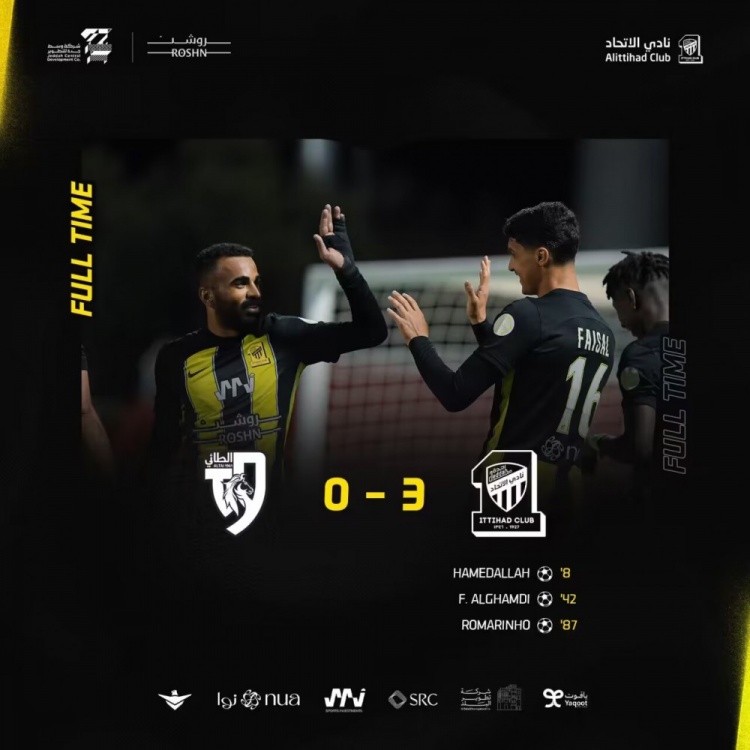 吉达联合首发:34-格罗赫、26-赫加齐、33-奥拉扬、15-卡德什、37-斯库尔、6-法尔汉(62'27-艾哈迈德-加姆迪)、7-坎特、16-加姆迪、17-萨哈菲(74'77-阿姆里)、90-罗马里尼奥、99-哈姆达拉