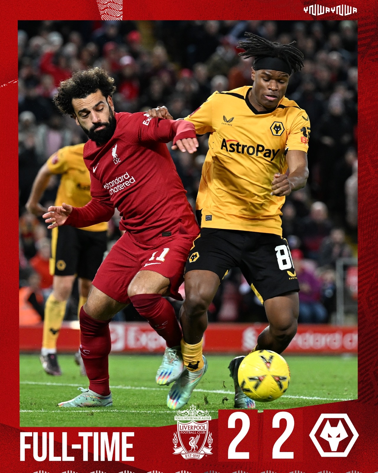 足总杯-阿利森送大礼努涅斯破荒黄喜灿救主 利物浦2-2狼队将重赛