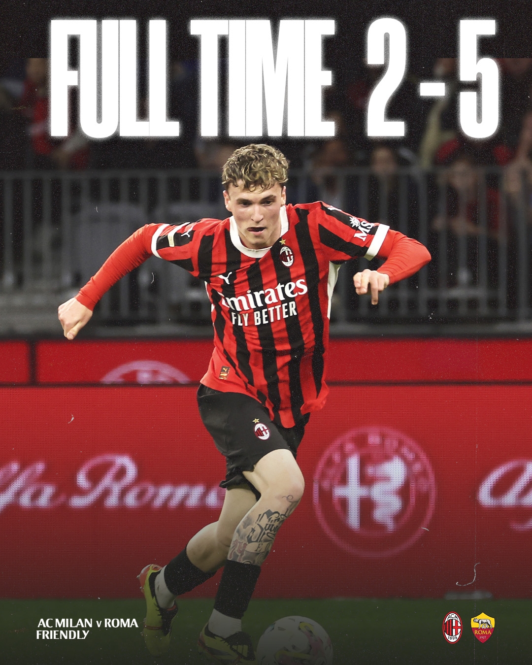 5月31日讯 北京时间5月31日19:00,足球友谊赛米兰迎战罗马的比赛,上半场特奥解围失误,巴尔丹齐推射破门,随后阿德利助攻特奥弧顶凌空斩扳平比分,亚伯拉罕补时抽射反超比分,半场结束,米兰1-2罗马。下半场奥卡福中柱,安吉利诺抽射扩大比分,奥卡福破门扳回一城,迪巴拉远射建功,阿兹蒙远射破门,最终罗马5-2米兰。
