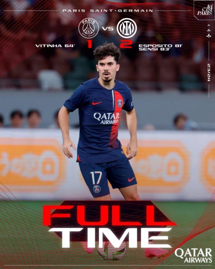 直播8月1日讯 北京时间8月1日晚上18:00,巴黎与国米进行一场友谊赛。上半场,阿森西奥中框,姆希塔良踩踏染黄。下半场,维蒂尼亚世界波,埃斯波西托、森西3分钟连入两球实现反超。全场结束,巴黎1-2国米。