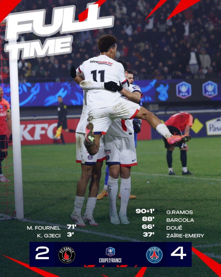 1月16日讯 北京时间1月16日04:00,法国杯32强巴黎挑战埃斯帕利圣马尔塞的比赛,上半场主队开场门前头球闪击得手,小埃梅里远射扳平比分,下半场巴尔特拉助攻杜埃推射破门反超比分,富尼耶建功再次扳平,巴尔科拉门前补射绝杀,拉莫斯点射杀死比赛。最终巴黎4-2逆转埃斯帕利圣马尔塞晋级16强。