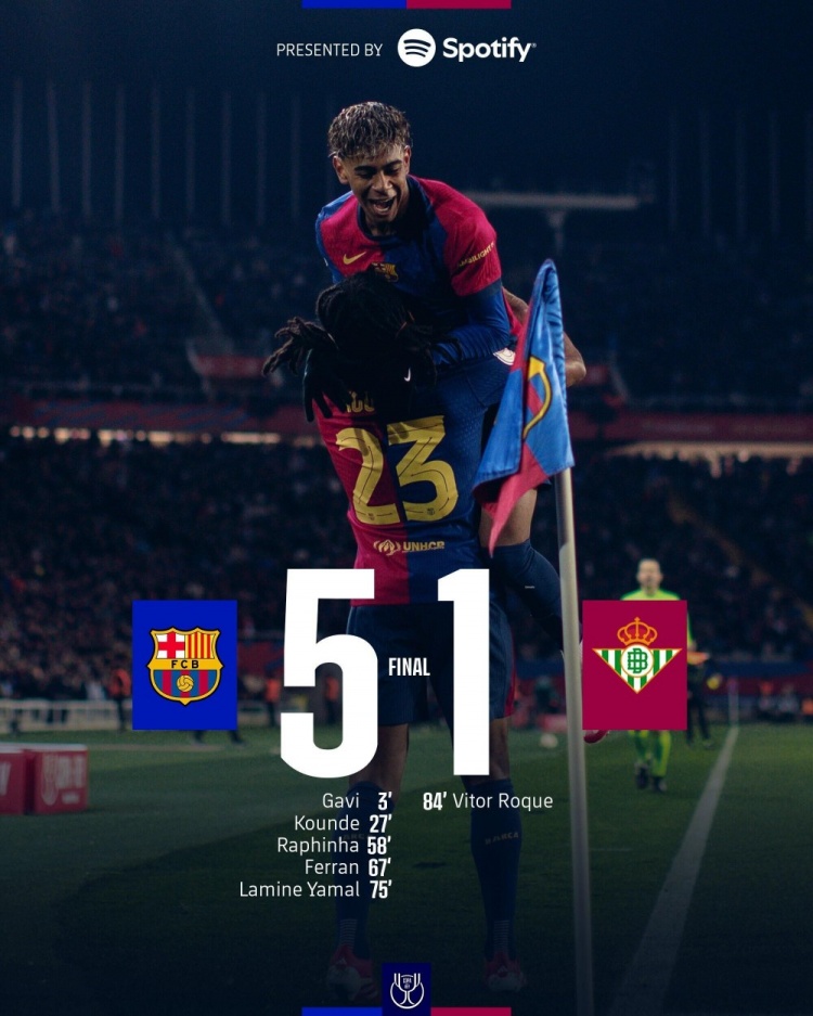 国王杯-巴萨5-1贝蒂斯晋级8强 巴萨两球被吹亚马尔传射奥尔莫两助