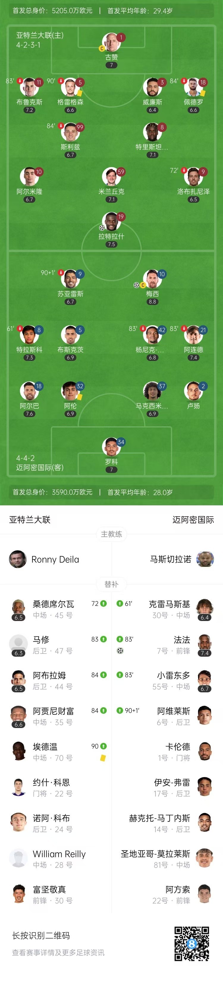 第11分钟,布鲁克斯禁区右侧停球后挑传门前,拉特拉什高高跃起头球破门,亚特兰大联1-0迈阿密国际。↓