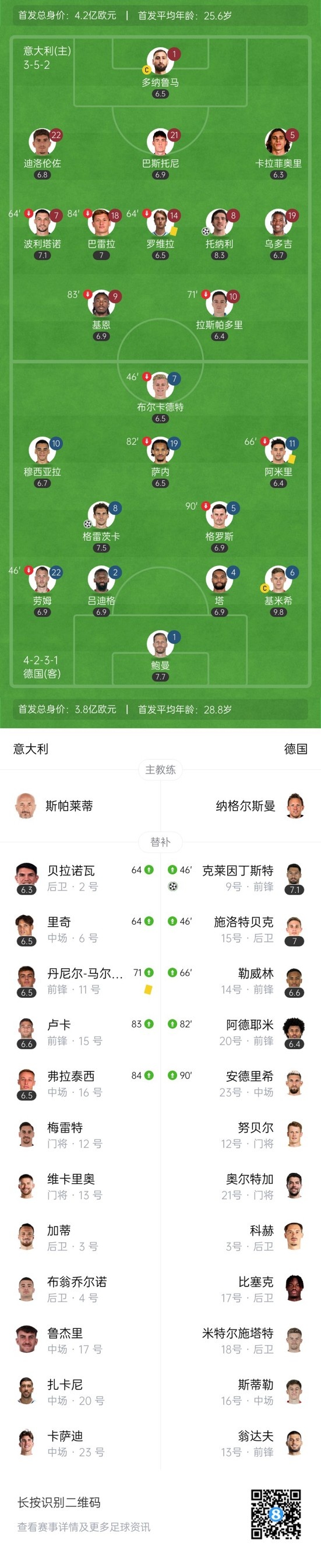 第8分钟,意大利闪击得手!巴雷拉右路斜传禁区波利塔诺横传门前塔解围不远,第二点托纳利抽射破门,意大利1-0德国。↓