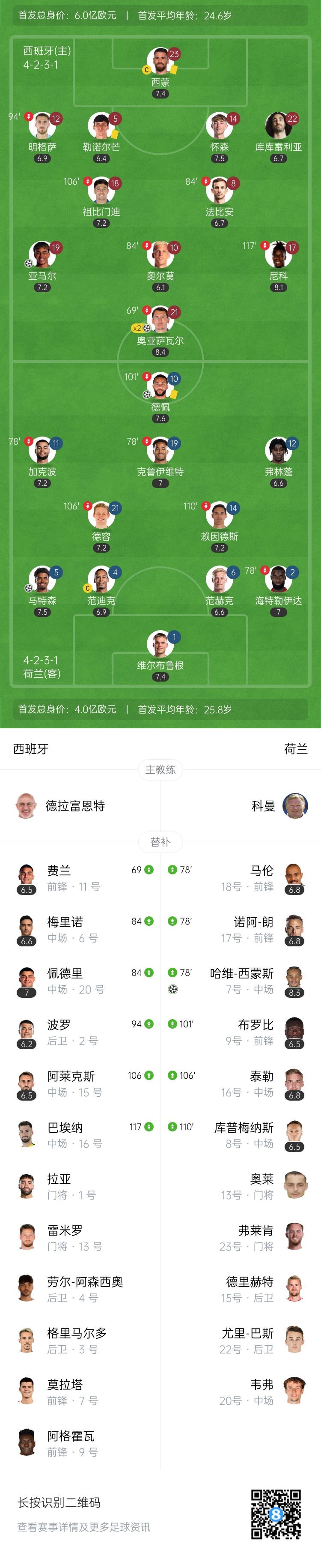 第103分钟,亚马尔接到队友挑传,禁区内摆脱防守后冷静打门,这球维尔布鲁根没能扑到,西班牙3-2荷兰。↓