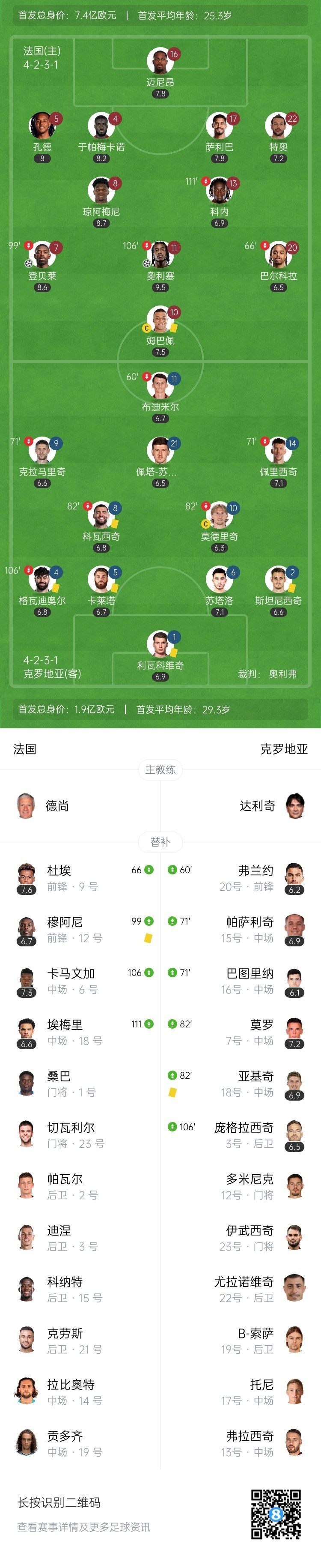 全场比赛结束,法国总比分2-2点球大战5-4淘汰克罗地亚晋级四强。