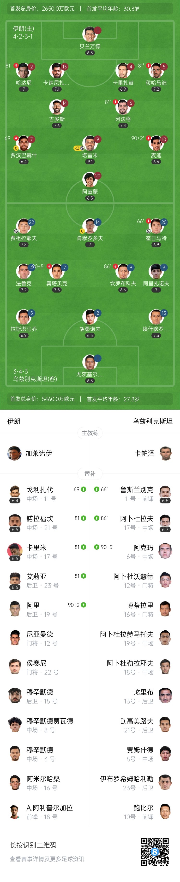 第83分钟,伊朗右路传中到禁区内,皮球经过反弹后,小禁区内塔雷米飞身垫射破门!伊朗2-2扳平乌兹别克斯坦↓