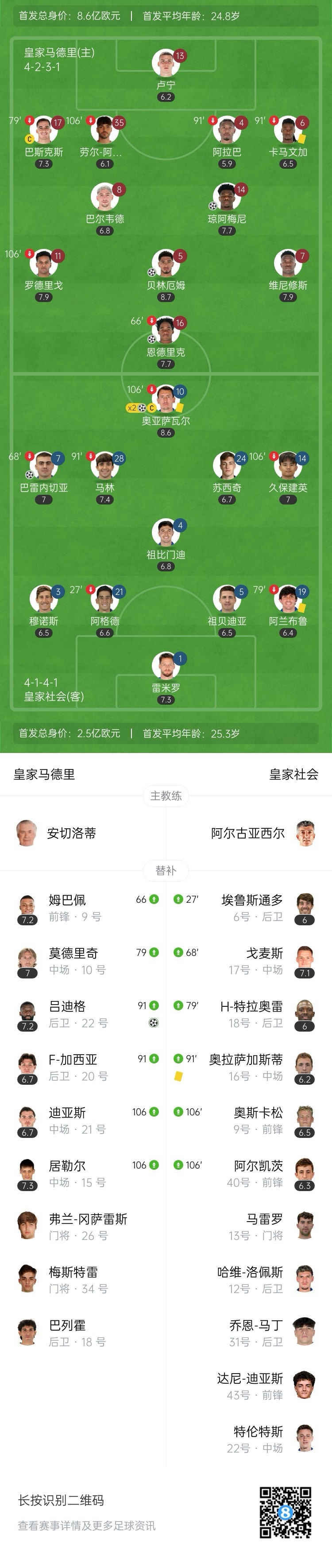 第82分钟,维尼修斯带球下到禁区左侧底线前,随后倒三角回敲,贝林厄姆中路跟进迎球垫射破门,3-2!↓