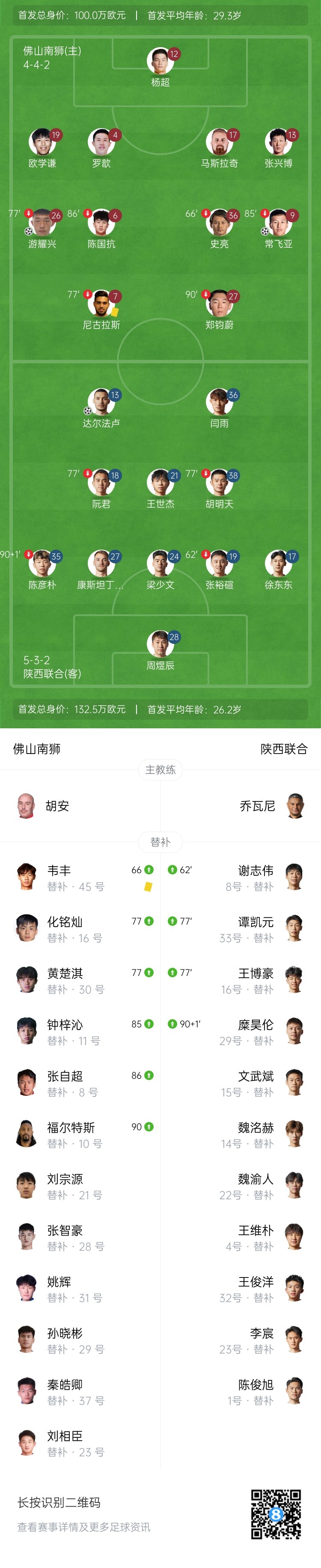 4月6日讯 北京时间4月6日15点30分,中甲第3轮,陕西联合做客南海体育中心对阵佛山南狮。上半场,周煜辰出球失误,游耀兴吊射破门,常飞亚扩大比分。下半场,达尔法卢扳回一球,但他补时阶段错失绝平单刀。最终陕西联合1-2佛山南狮。
