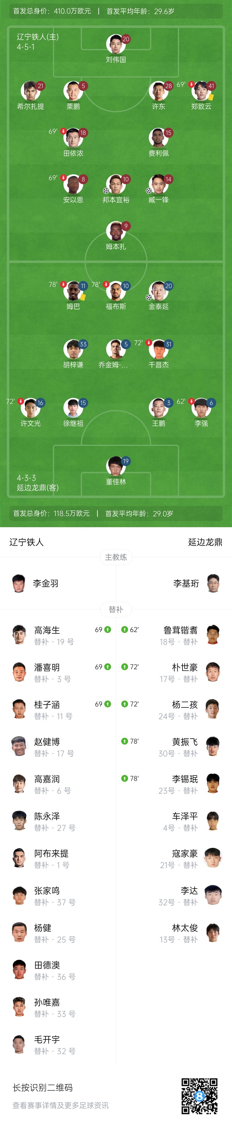 4月6日讯 北京时间4月6日15时,中甲第3轮,辽宁铁人坐镇沈阳奥体中心体育场迎战延边龙鼎。上半场,臧一锋破门为辽宁铁人取得领先,姆本扎射门击中门框,金泰延进球扳平比分!半场战罢,辽宁铁人暂1-1延边龙鼎;下半场,邦本宜裕主罚任意球直接破门,高海生神门击中门框!全场比赛结束,辽宁铁人2-1延边龙鼎!