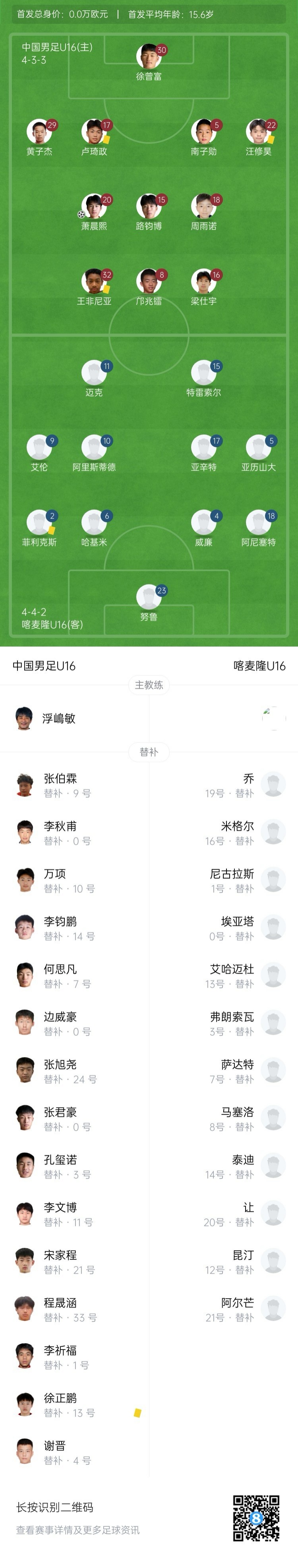 全场比赛结束,U16中国男足1-0战胜喀麦隆U16。