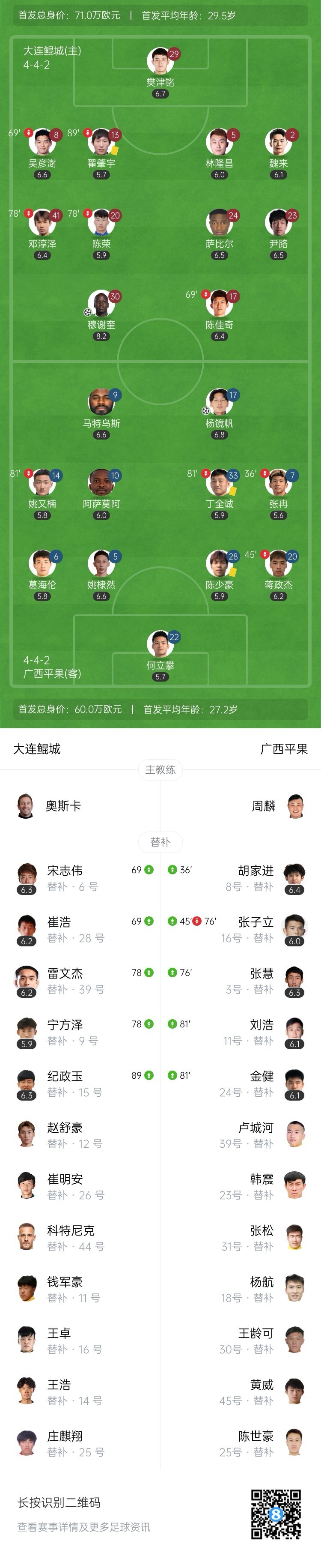 广西平果客场领先!第6分钟,阿萨莫阿主罚角球开出,马特乌斯抢点甩头攻门,皮球打在杨镜帆后背上反弹折射入网,大连鲲城0-1广西平果!↓