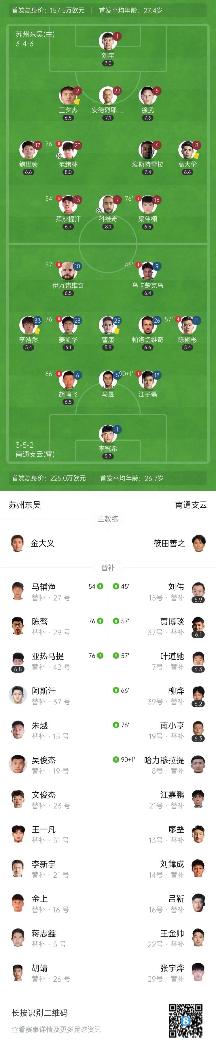 开赛7轮不败!苏州东吴2-0南通支云 科维奇建功拜沙提汗破门