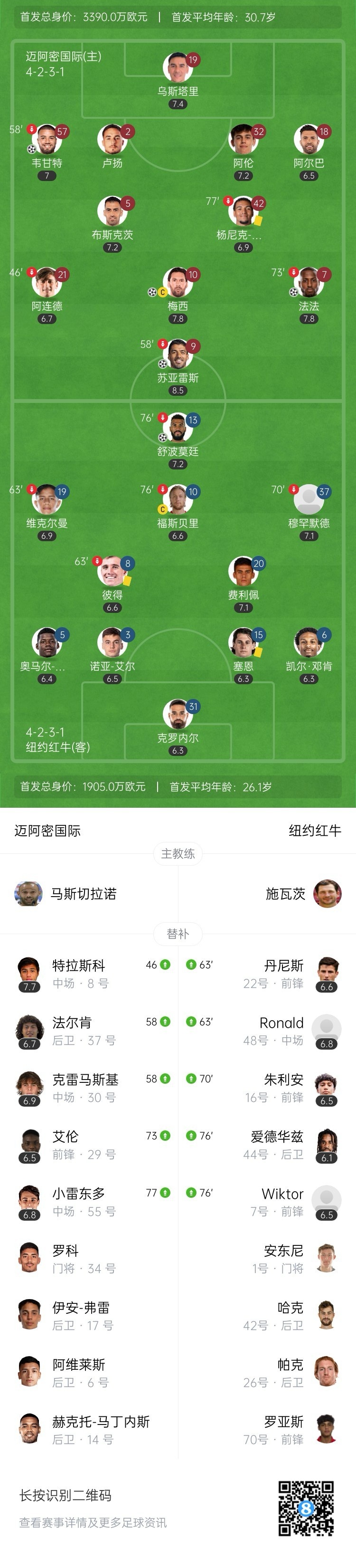 全场比赛结束,迈阿密国际主场4-1战胜纽约红牛。