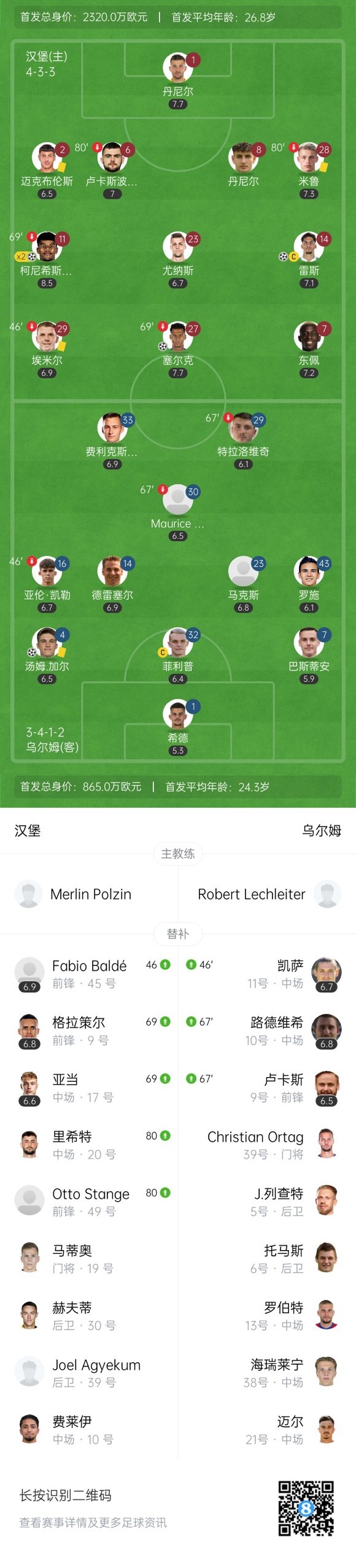上半场补时6分钟,汉堡3-1乌尔姆。