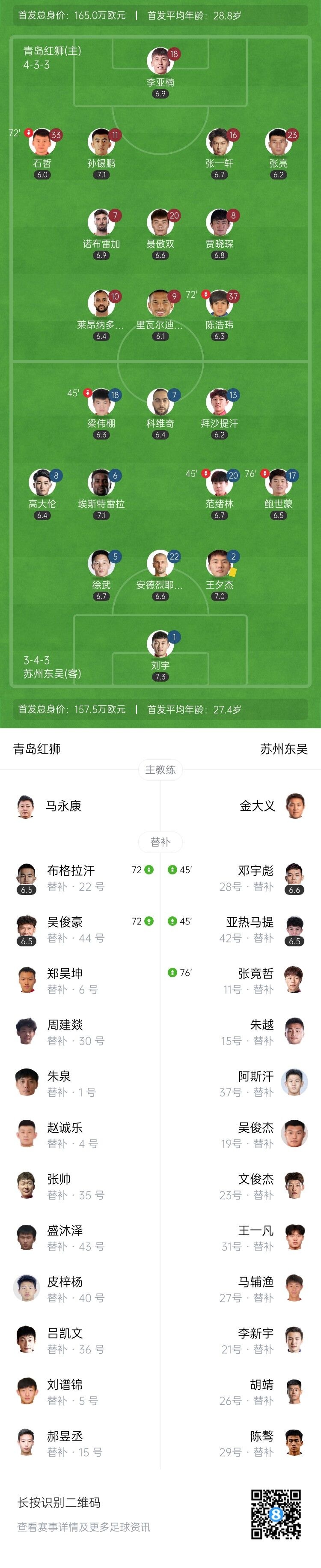 5月11日讯 北京时间5月11日下午15:30,中甲第8轮,青岛红狮坐镇天泰体育场迎战苏州东吴。上半场,王夕杰染黄,拜沙提汗失良机。下半场,刘宇神扑救主,科维奇88分钟绝杀。全场结束,青岛红狮0-1苏州东吴。本场过后,青岛红狮积4分排名倒数第二,苏州东吴积16分排名第四。