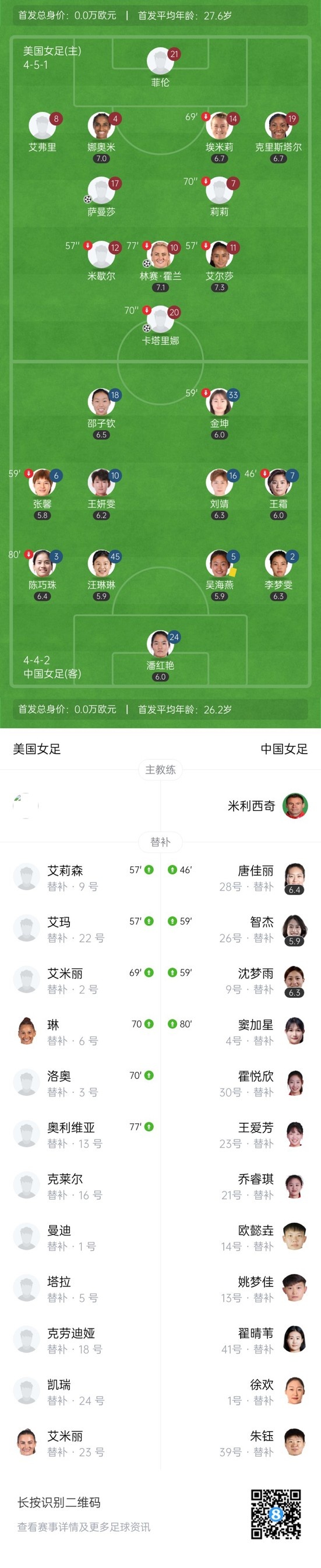 第27分钟,美国女足首开记录!米歇尔右路下底横传门前艾尔莎包抄打门被封堵第二点卡塔里娜补射破门,美国女足1-0中国女足。↓