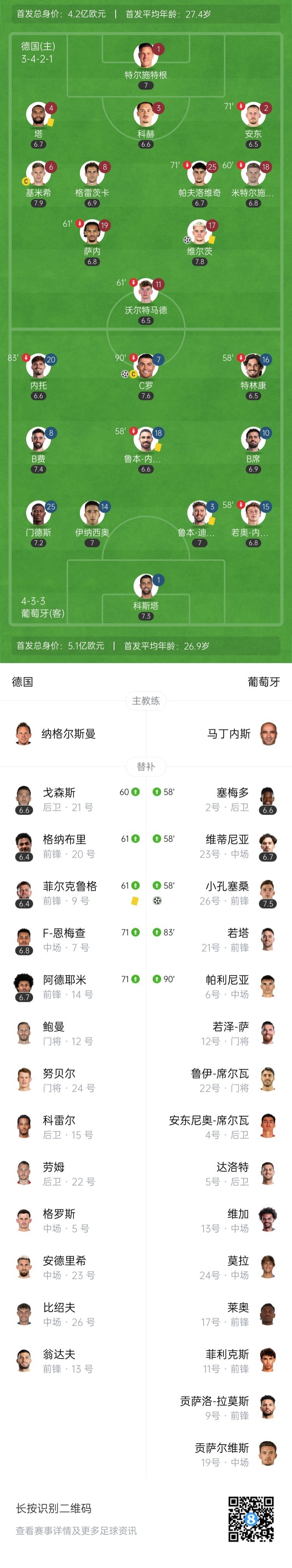 第48分钟,基米希大禁区前精妙挑传,维尔茨前插头球破门!主裁观看视频回放后判罚进球有效!德国1-0领先葡萄牙↓