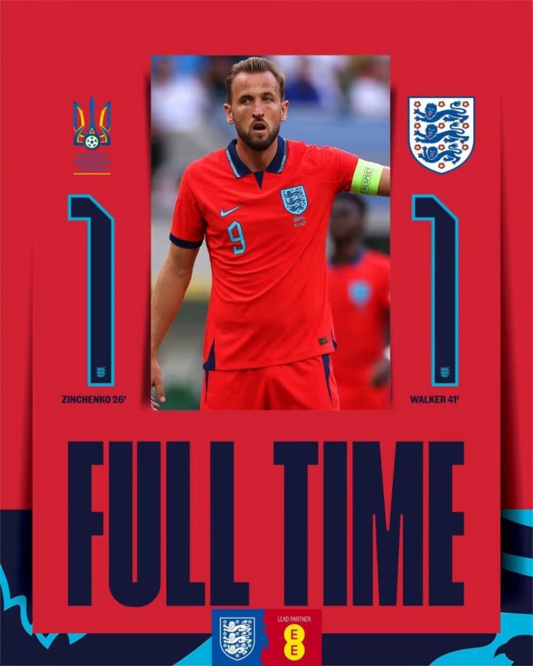 全场比赛结束,英格兰1-1乌克兰。