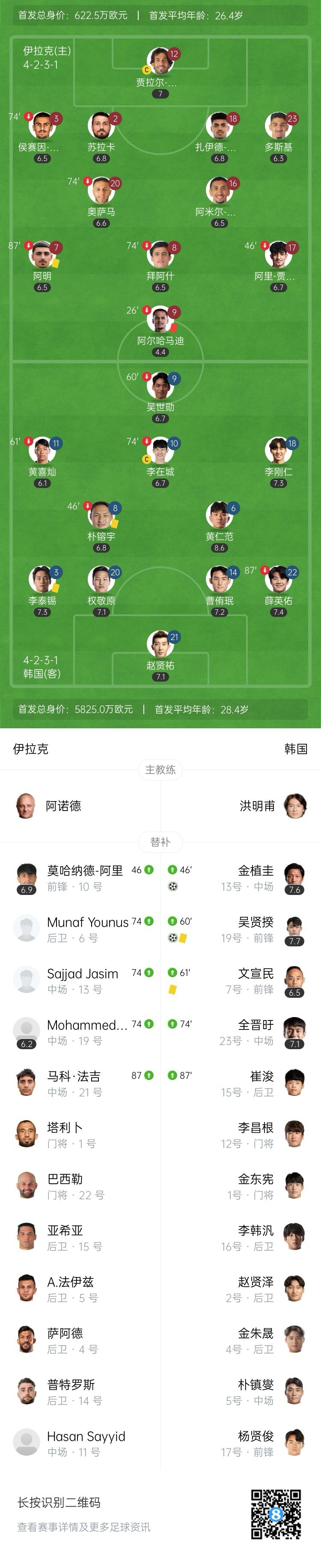 韩国客场2球领先!吴贤揆替补破门!第81分钟,韩国中场直塞,全晋旴右路插上传中,吴贤揆包抄轻松推射入网,伊拉克0-2韩国!↓