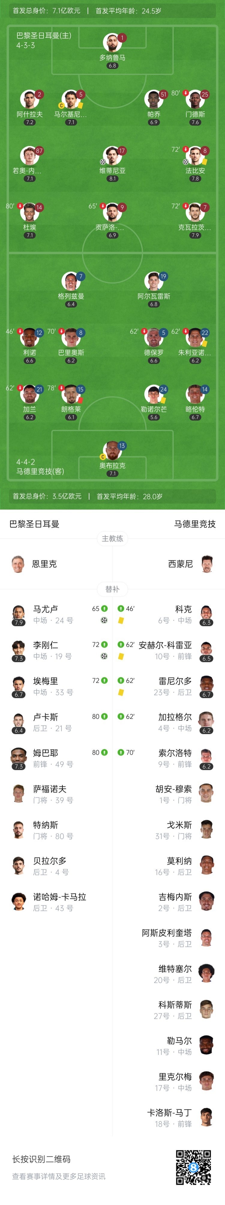 第90+6分钟,禁区内马尤卢打门打在勒诺尔芒手上,VAR介入判罚点球,李刚仁主罚命中,巴黎4-0领先↓