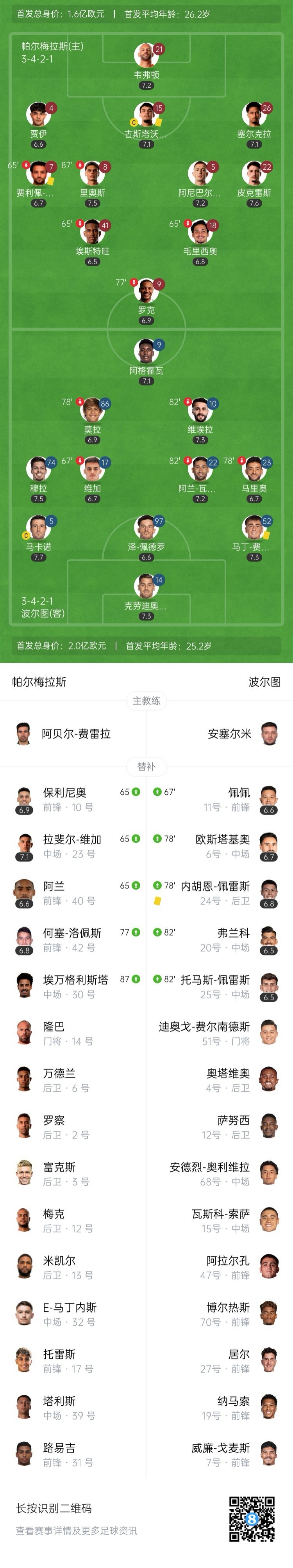 全场比赛结束,帕尔梅拉斯0-0波尔图。