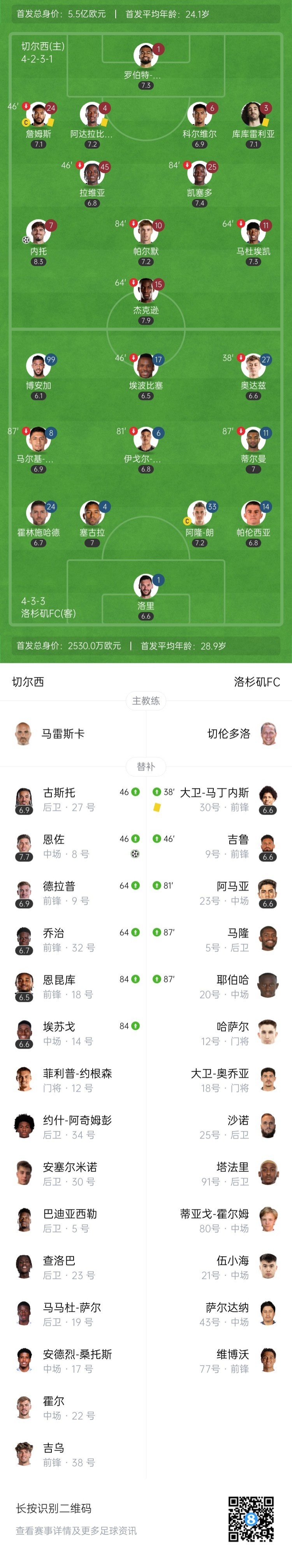 第80分钟,切尔西右路进攻,帕尔默向前做球,德拉普下底传中送到门前,恩佐插上抢点入网,切尔西2-0领先↓