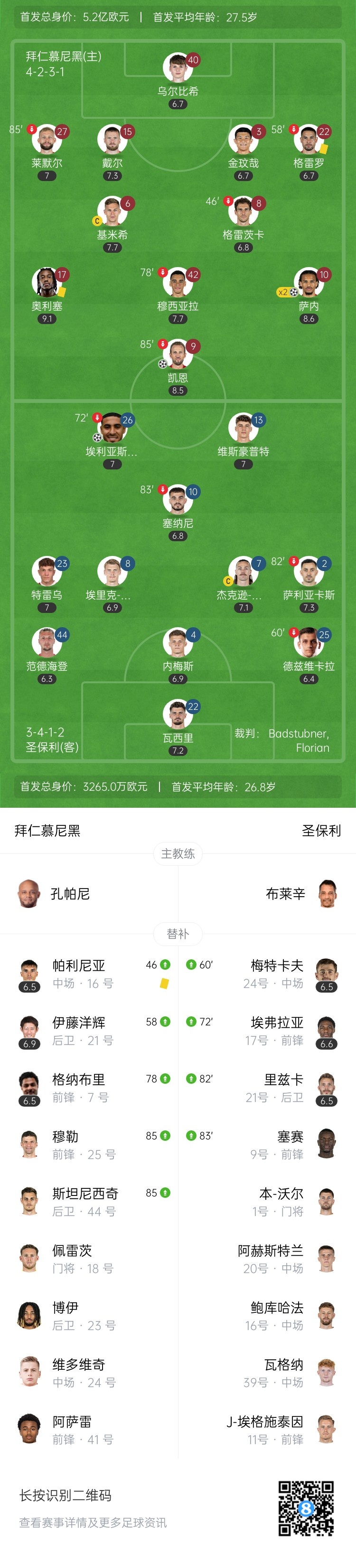 第71分钟,凯恩回做,奥利塞挑传,凯恩前插得球横传门前,萨内无人盯防轻松破门,拜仁3-1圣保利。↓