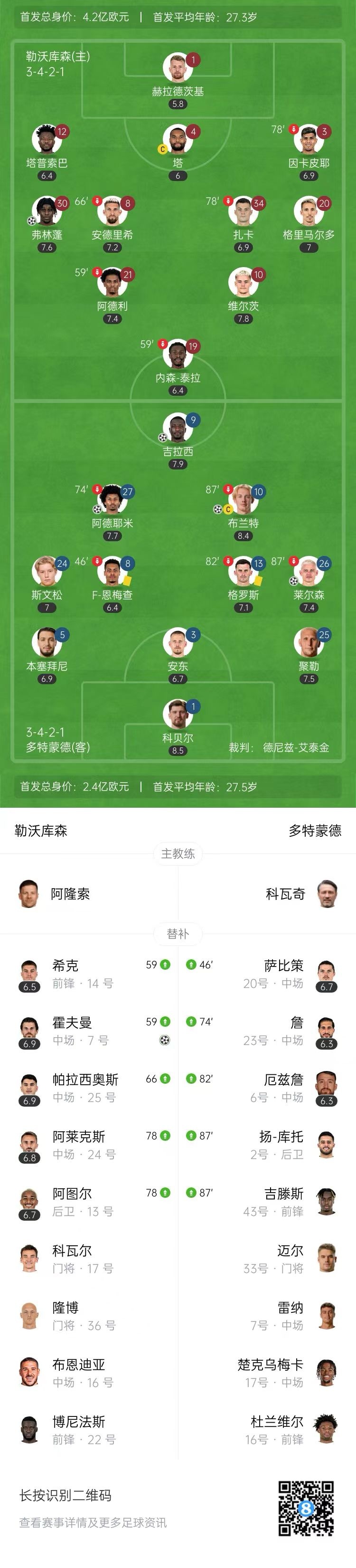 第33分钟,阿德耶米下底倒三角回传,布兰特跟进无人盯防推射轻松破门,多特扳平比分,1-1!↓