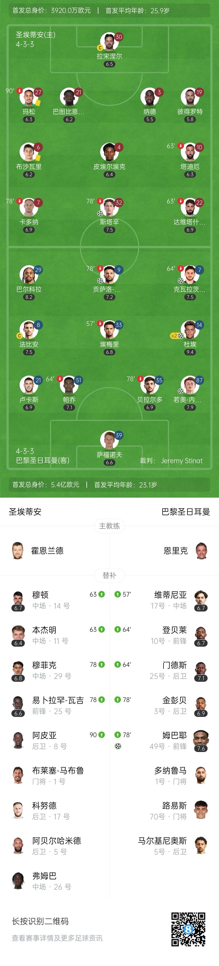 全场比赛结束,巴黎6-1圣埃蒂安。