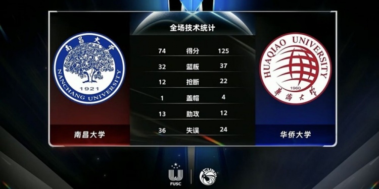 末节比赛,由于场上分差较大,双方打得比较放松,南昌大学也能抢断对手传球打出反击,王政皓的撤步三分也很潇洒,不过华侨大学再次加强防守强度给出回应,分差一直保持在五十分左右,最终华侨大学125-74大胜南昌大学。