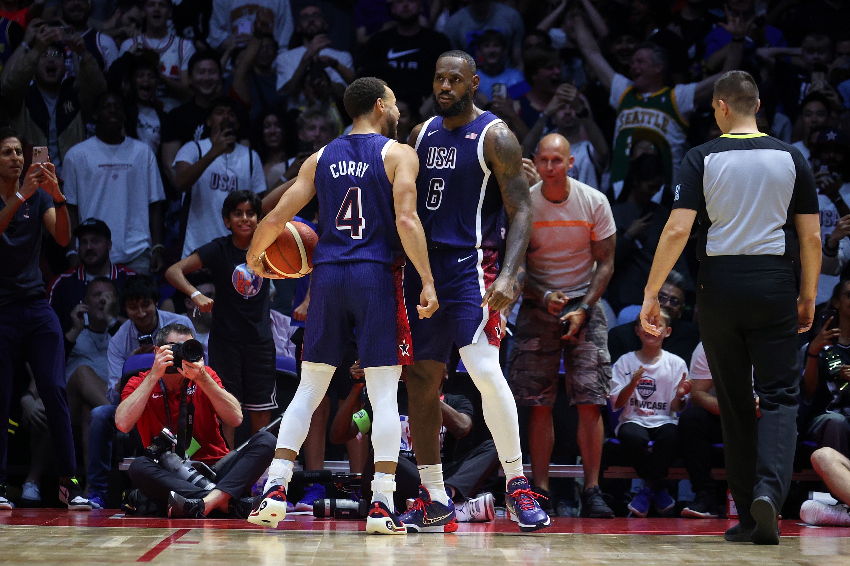 美国男篮:詹姆斯20分6篮板4助攻1抢断1封盖(11中8),布克3分、恩比德15分8篮板5助攻、霍勒迪10分6篮板3助攻、库里13分3篮板2助攻、爱德华兹11分、戴维斯10分7篮板、阿德巴约4分、塔图姆4分、怀特2分
