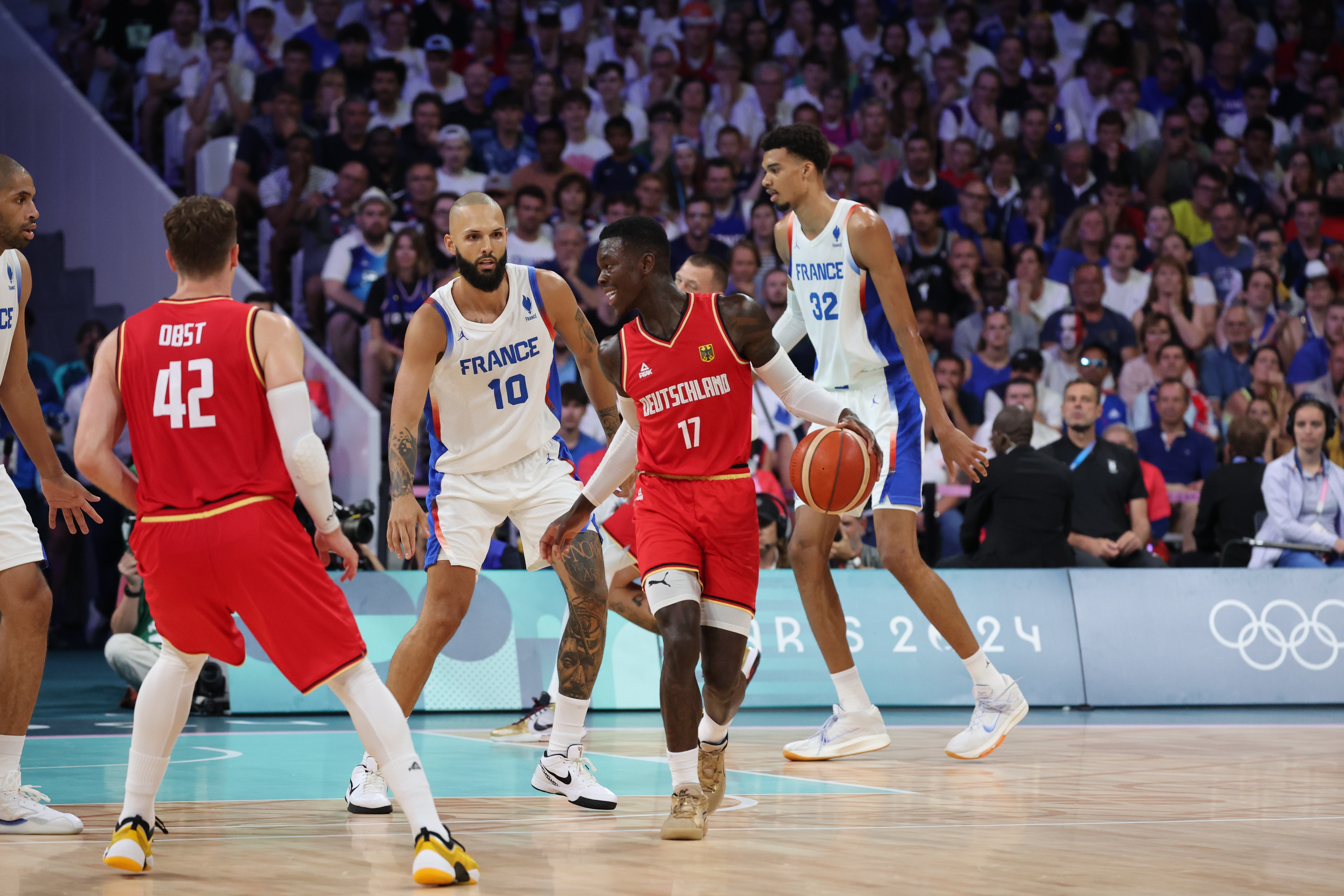 比赛开始,法国连中三分占据主动,德国内外开花迅速回应,德国一波8-2领先6分结束首节。次节德国轻松将分差拉开到两位数,法国进攻端完全哑火,施罗德和小瓦格纳联手带队轰出16-2的进攻高潮,半场战罢德国48-27领先法国21分。易边再战,双方围绕20分的分差展开争夺,富尼耶和巴图姆相继命中三分,小瓦格纳隔扣2+1强势回应,末节法国大举反击完成11-0的攻击波迅速迫近比分,邦加三分破荒,德国及时找回状态,文班连中三分也为时已晚。最终,德国85-71击败法国,锁定小组第一。