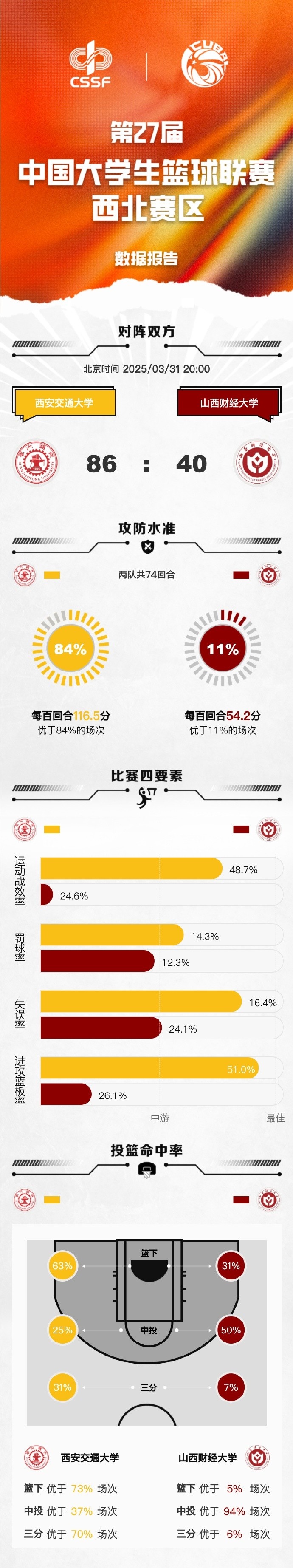末节大局已定,西安交大也开始走马换将,山西财大压力骤减的情况下也逐渐稳定拿分,孙晓涵开局命中三分打开局面,不过整体上西安交大仍然占据绝对上风并继续扩大领先优势。最终,西安交通大学86-40大胜山西财经大学夺得西北赛区女子组冠军。