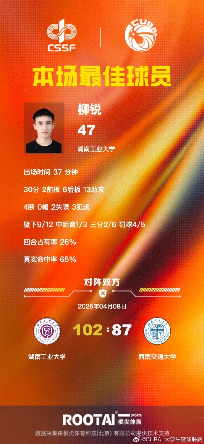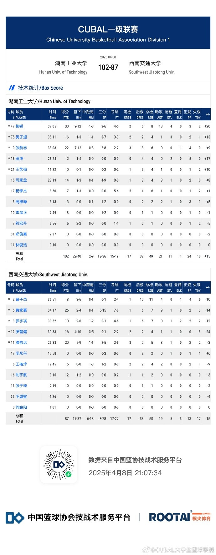 🏀CUBAL-柳锐30+8+13 黄家豪26+7+9 湖南工大轻取西南交大