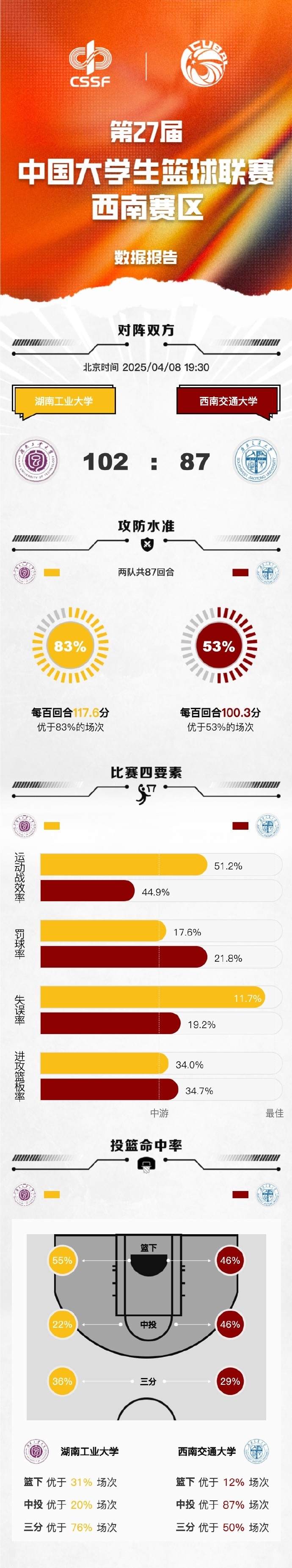 湖南工业大学:柳锐30分8篮板13助攻4抢断、张航志22分6篮板、吴子煜16分4篮板3抢断、司家丞14分4篮板3助攻、杨李杰7分6篮板、祁宏升5分、周梓峰3分2篮板2助攻。